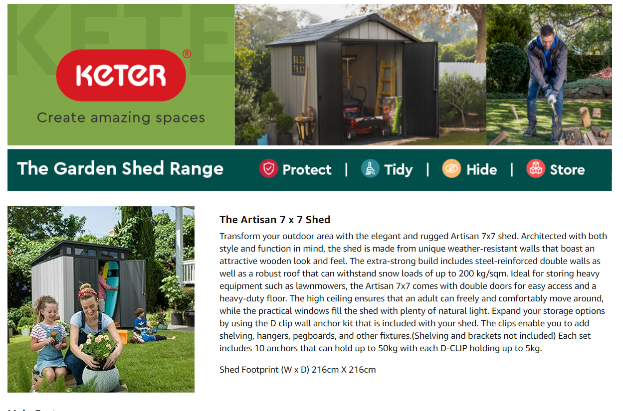 Product Dimensions 214 x 218 x 226 cm; 141.4 kg Part number 17203426 Item display height 226 centimetres Item display length 214 centimetres Item display width 218 centimetres Item display weight 139 Kilograms Material type Plastic Manufacturer Keter Item model number 17203426 ASIN B077FHZ1TC